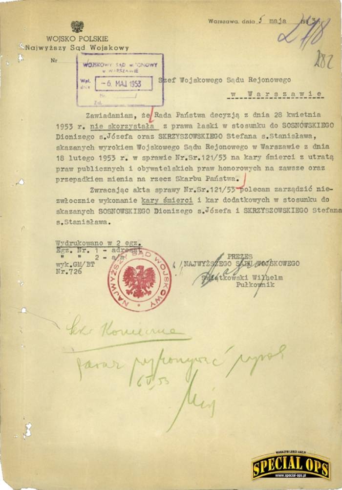 Wkrótce rozpoczęto szkolenie konspiratorów do pracy w komunistycznej Polsce. W nocy 4/5 listopada 1952 dwaj przeszkoleni kursanci: Dionizy Sosnowski oraz Stefan Skrzyszowski, po starcie samolotu z lotniska USAF w Wiesbaden (RFN) skoczyli ze spadochronem w rejonie Koszalina. Wskutek infiltracji krajowych i zachodnich struktur WiN przez bezpiekę, 6 grudnia zostali aresztowani, 16 lutego skazani na śmierć, 15 maja 1953 wyrok wykonano. Ich szczątki odnaleziono w kwaterze „Ł” Cmentarza Wojskowego na Powązkach dopiero w maju 2013.