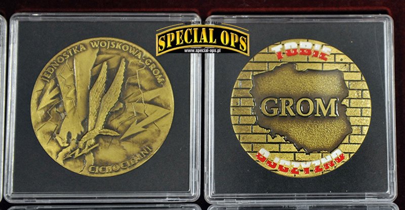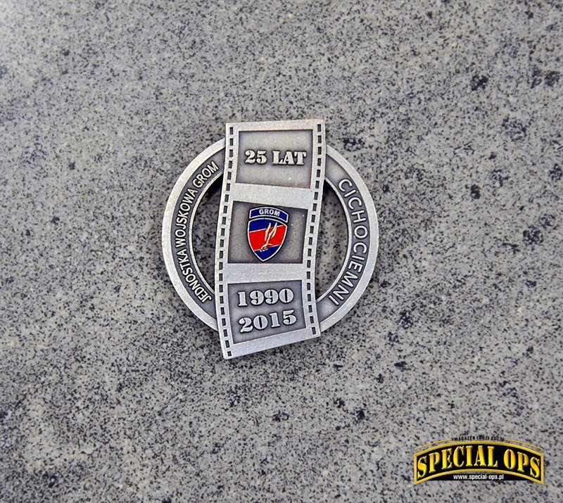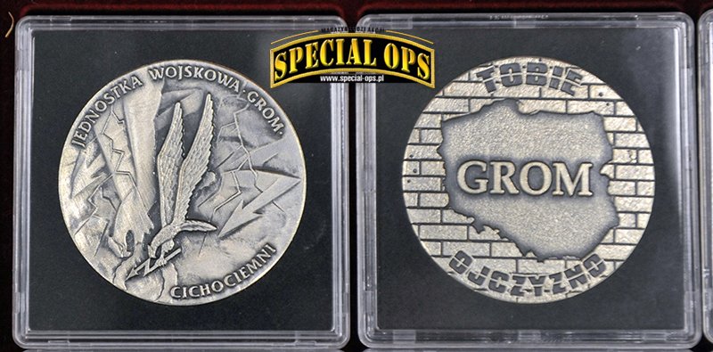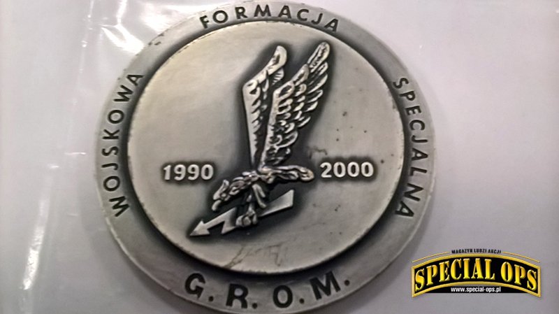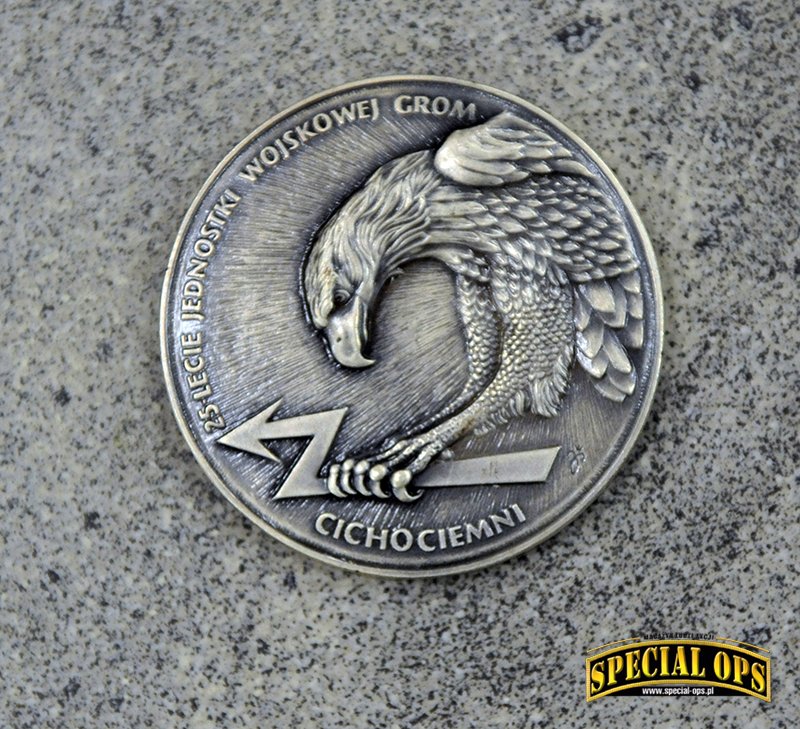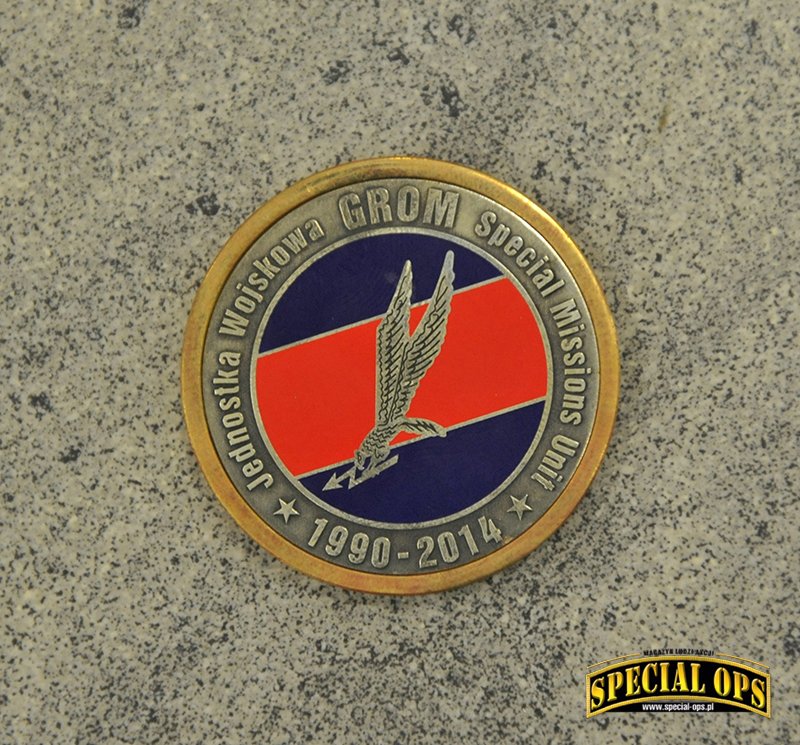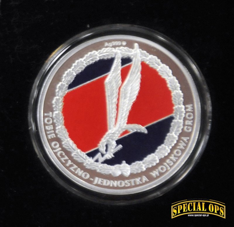 Tak, z tego co wiem, GROM jest to jedyna jednostka wojskowa, która została uhonorowana wydaniem przez Skarbiec Mennicy Polskiej srebrnych monet z okazji 25-lecia powstania Jednostki. Okazja piękna, bo to w końcu ćwierćwiecze, natomiast okazało się, że na coinie jest błąd. Zamiast słowa Jednostka, zostało wybite „Jenoska”. Po tym zdarzeniu dalsza seria monet pokazała się bez oznaczeń nawiązujących do JW GROM. Zamiast Gromika pojawiła się mapa Polski z wpisanym w nią orłem. Oczywiście była akcja wymiany i można było odesłać coina z błędem, w zamian otrzymywało się już poprawnie wybitego. Ja tego rarytasiku się nie pozbyłem i zamówiłem drugą monetę, poprawnie wybitą.