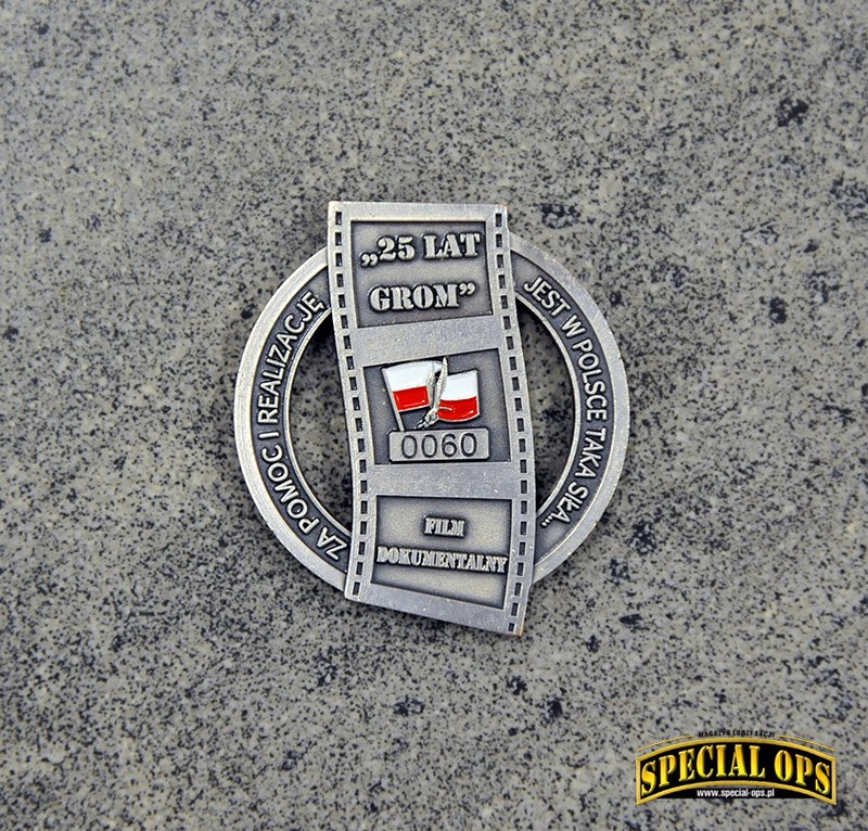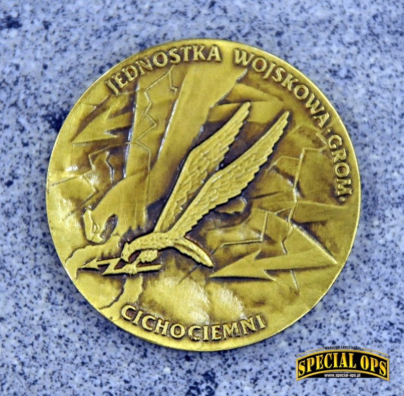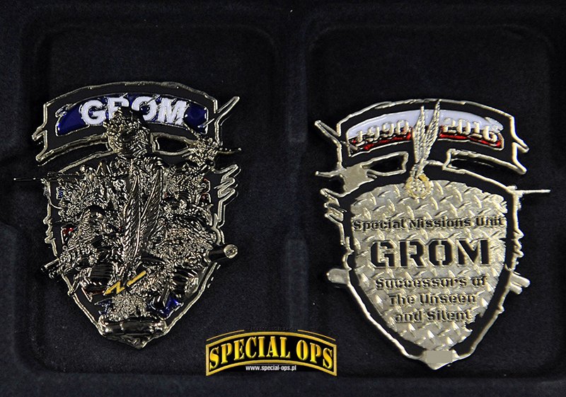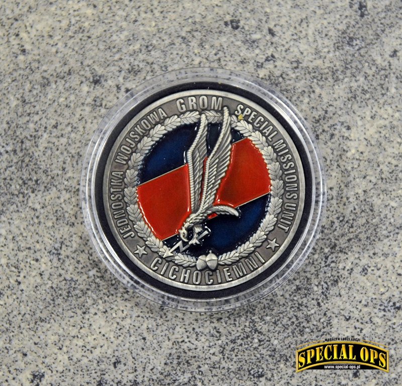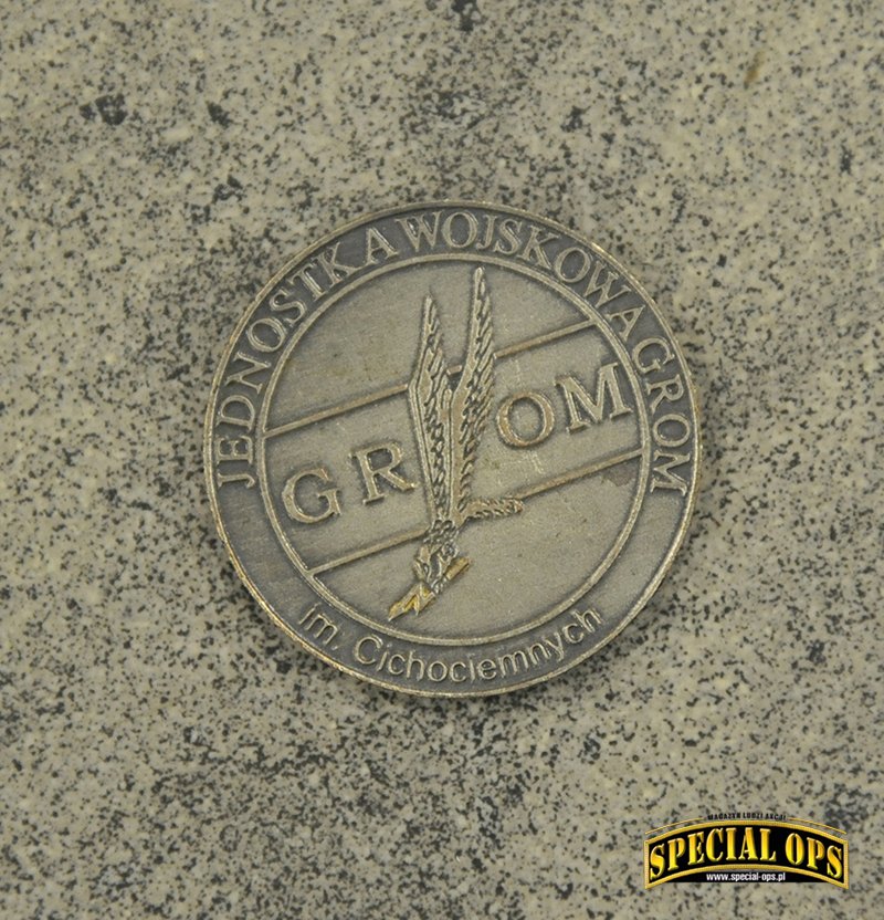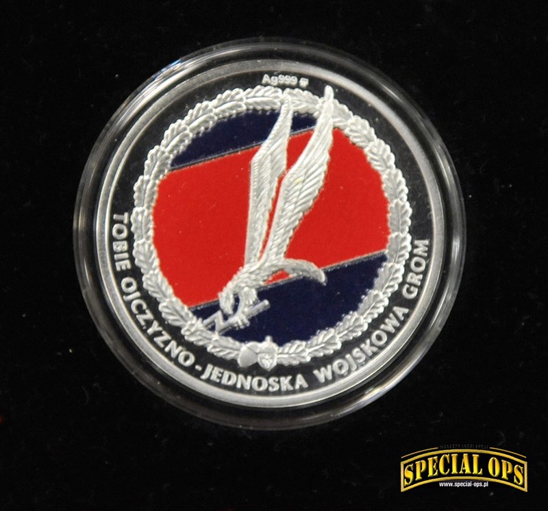 Tak, z tego co wiem, GROM jest to jedyna jednostka wojskowa, która została uhonorowana wydaniem przez Skarbiec Mennicy Polskiej srebrnych monet z okazji 25-lecia powstania Jednostki. Okazja piękna, bo to w końcu ćwierćwiecze, natomiast okazało się, że na coinie jest błąd. Zamiast słowa Jednostka, zostało wybite „Jenoska”. Po tym zdarzeniu dalsza seria monet pokazała się bez oznaczeń nawiązujących do JW GROM. Zamiast Gromika pojawiła się mapa Polski z wpisanym w nią orłem. Oczywiście była akcja wymiany i można było odesłać coina z błędem, w zamian otrzymywało się już poprawnie wybitego. Ja tego rarytasiku się nie pozbyłem i zamówiłem drugą monetę, poprawnie wybitą.
