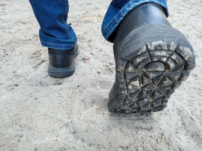 Buty testowałem również w warunkach terenowych – survivalowych. W terenie piaszczystym sprawdziły się kierunkowe wypustki, zapewniając dobrą przyczepność. W terenie leśnym wzmocnione noski buta dobrze chronią palce stóp przed wszelkimi uderzeniami w wystające konary czy kamienie. Na kamienistym, nierównym podłożu stopa była stabilna, a na podeszwie nie odczuwałem ostrych krawędzi kamieni. Struktura podeszwy zapewnia komfort poruszania się.